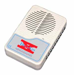 The Dec-Aid communicator is a small, putty-colored, rectangular communication device. It is a digital recorder that can record up to 10 six-second messages. There are 10 switch jacks to select the message you want to play. Note: This device is now called the VoicePal 8.